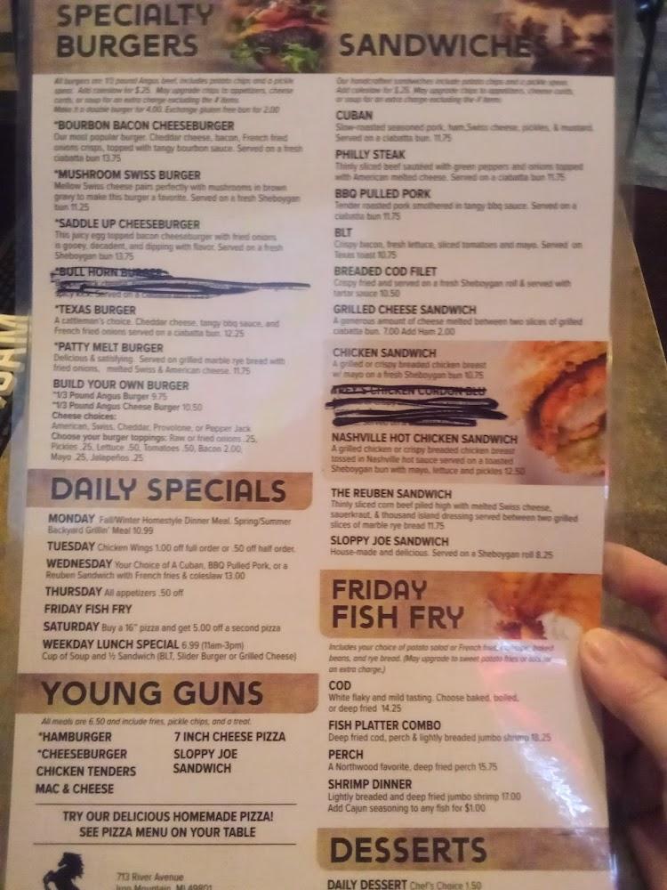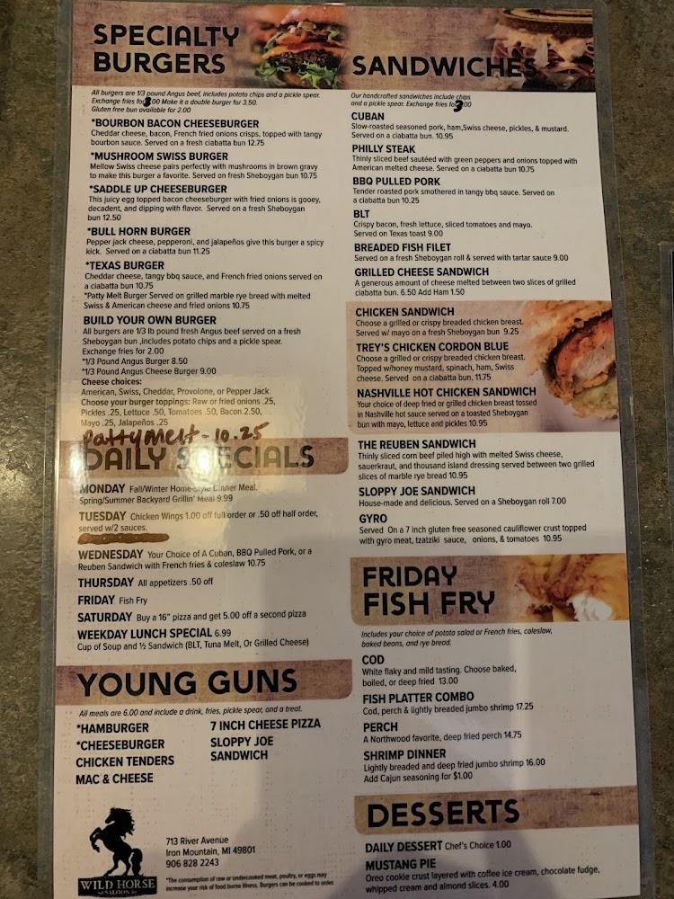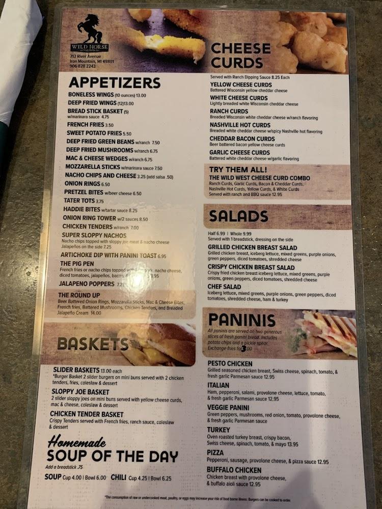 Welcome to Wild Horse Saloon, your go-to destination for a vibrant dining experience in the heart of Iron Mountain, MI. Enjoy a mouthwatering variety of grilled dishes and refreshing cocktails in a relaxed and stylish setting. Whether you're looking to grab a quick bite, savor a leisurely lunch, or enjoy a lively dinner solo or with friends, we’ve got you covered. With amenities like live concerts, karaoke nights, and a wide selection of beers, there's never a dull moment! Accessibility options and fast service ensure everyone feels at home. Join us for happy hour specials and discover your new favorite spot!